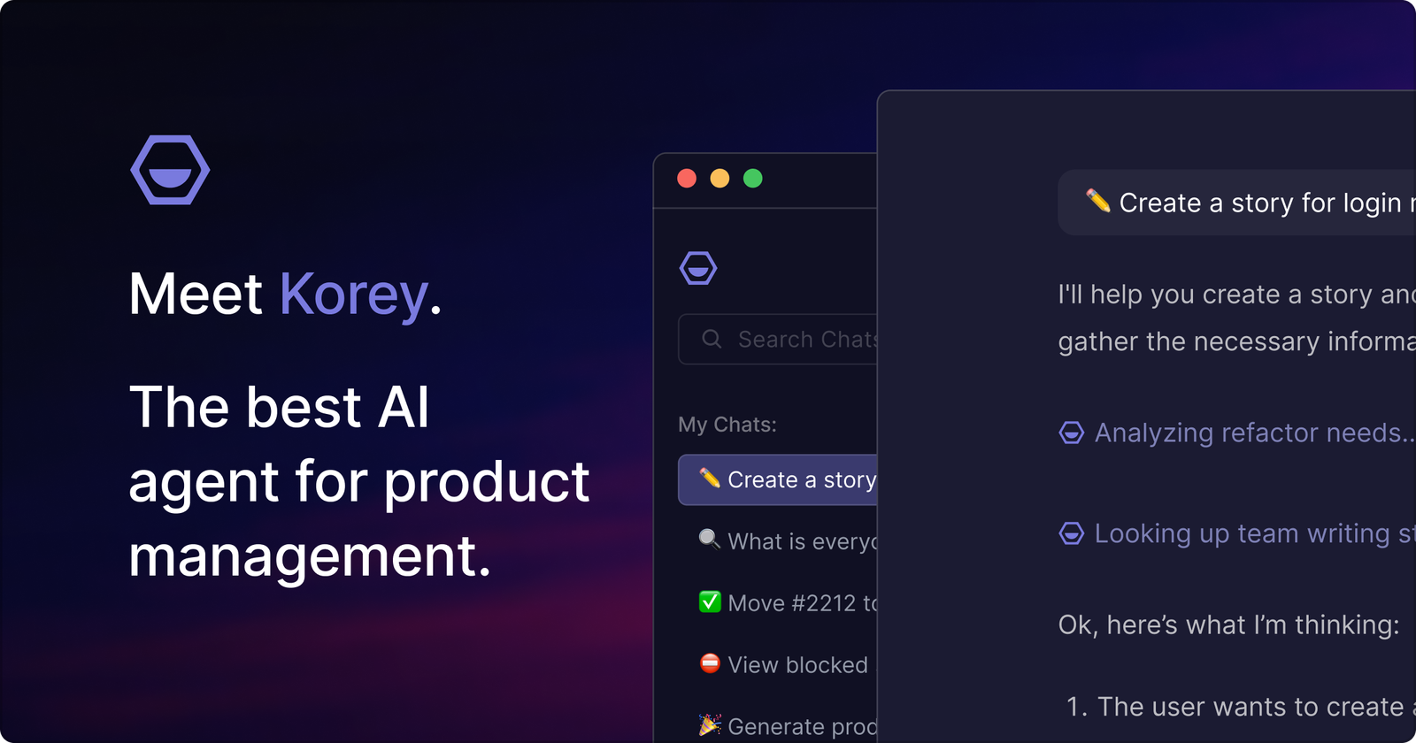 Descrição da ferramenta: Korey é uma ferramenta de gerenciamento de produtos baseada em IA, que auxilia equipes de produto e engenharia na criação de especificações, divisão de tarefas, acompanhamento do progresso e geração de notas de lançamento, integrando-se ao GitHub Issues e Shortcut.