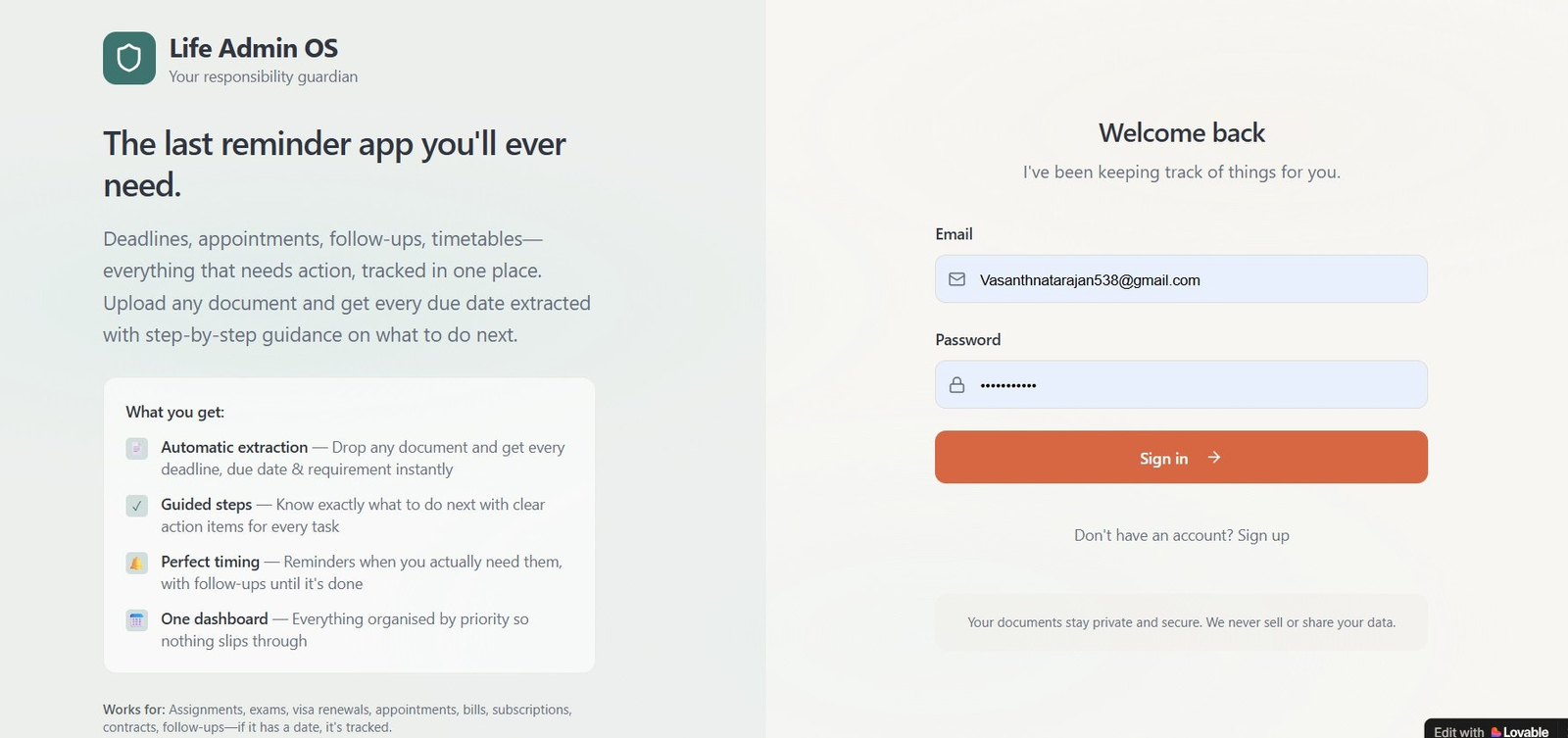 Descrição da ferramenta: Life Admin OS é uma plataforma que organiza tarefas administrativas a partir de documentos e comunicações, facilitando o acompanhamento de ações, prazos e prioridades para manter a vida pessoal e profissional sob controle.