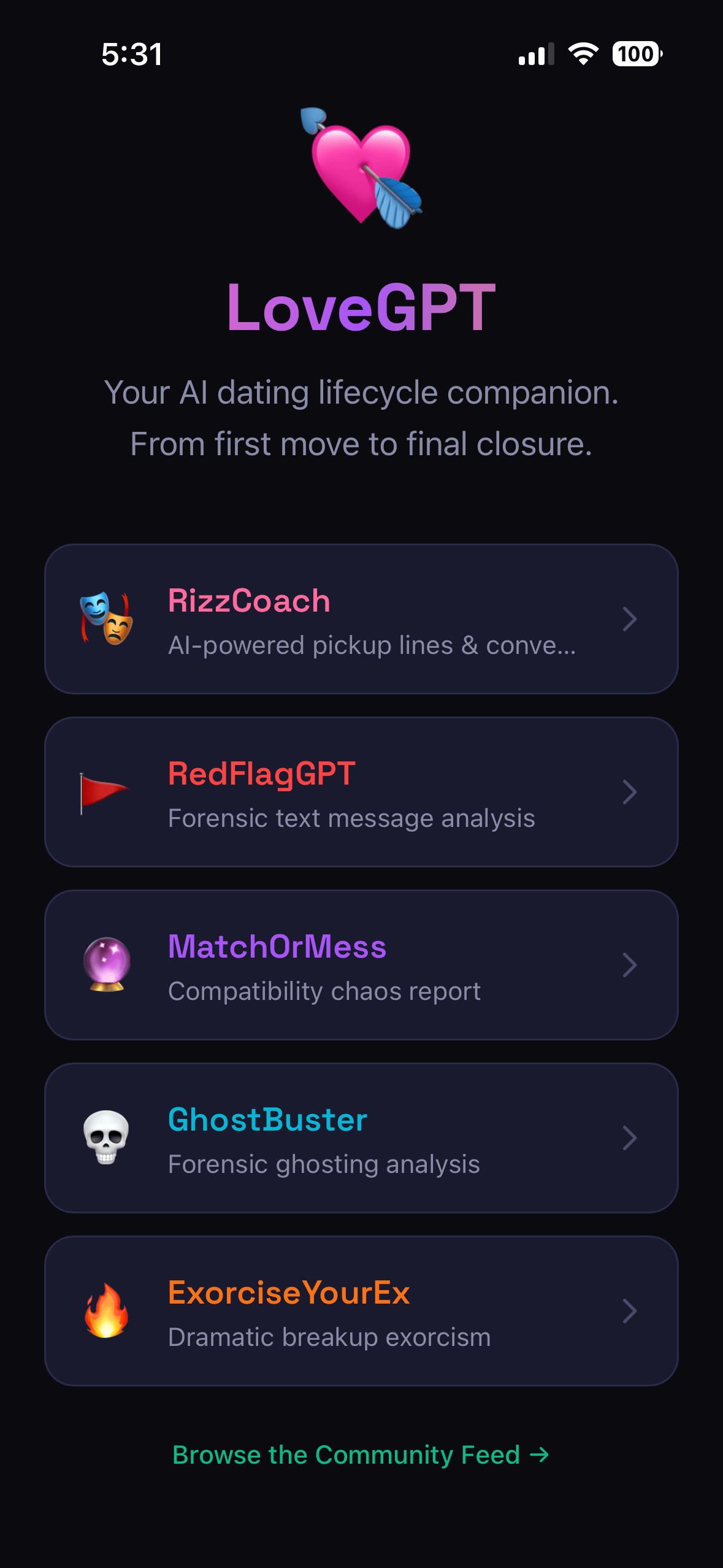 Descrição da ferramenta: LoveGPT é uma plataforma de inteligência artificial que auxilia no ciclo de relacionamento, oferecendo recursos como análise de compatibilidade, avaliação de mensagens e estratégias para melhorar a interação amorosa.