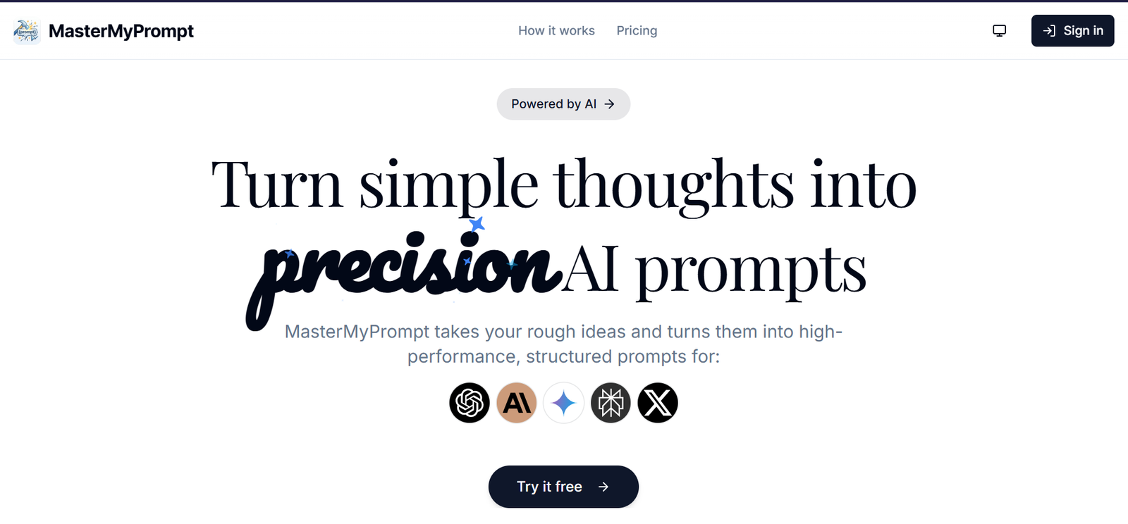 MasterMyPrompt converte ideias iniciais em prompts estruturados e otimizados para diversas plataformas de IA, eliminando a necessidade de templates ou cursos de engenharia de prompts, facilitando a geração rápida e precisa de comandos.