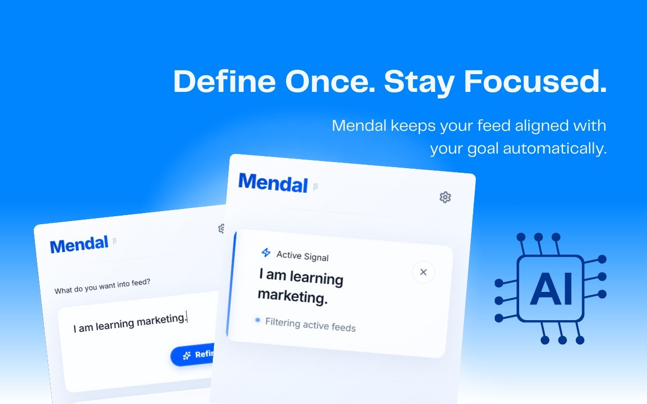 Descrição da ferramenta: Mendal é uma extensão de navegador que utiliza inteligência artificial para filtrar feeds de mídias sociais, priorizando conteúdos relevantes e alinhados às intenções do usuário, otimizando a experiência nas redes sociais.