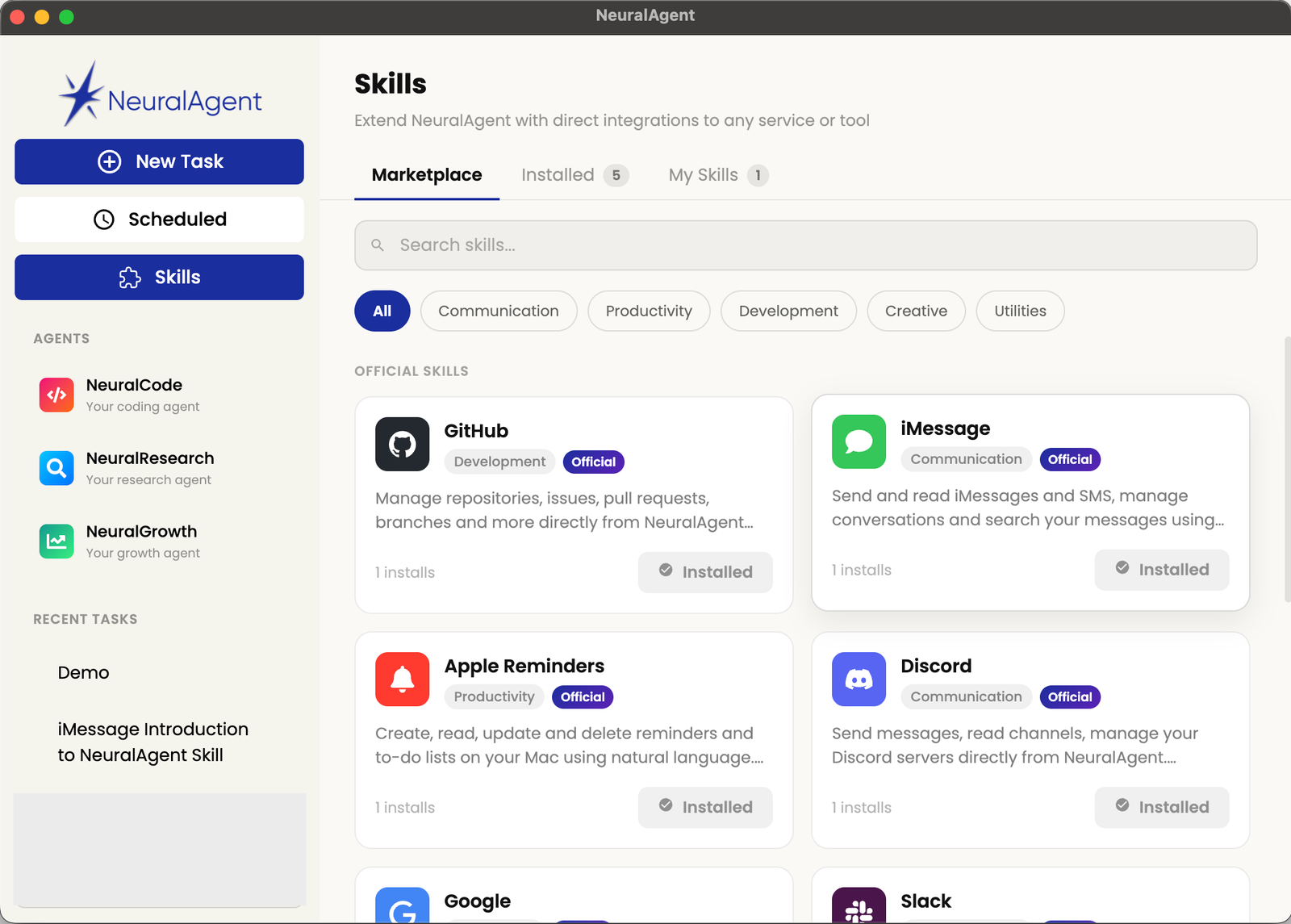 Descrição da ferramenta: NeuralAgent 2.0 Skills expande as capacidades do assistente de IA, permitindo conexão e automação com diversas plataformas, APIs e dispositivos, facilitando tarefas complexas através de comandos simples e integrados.