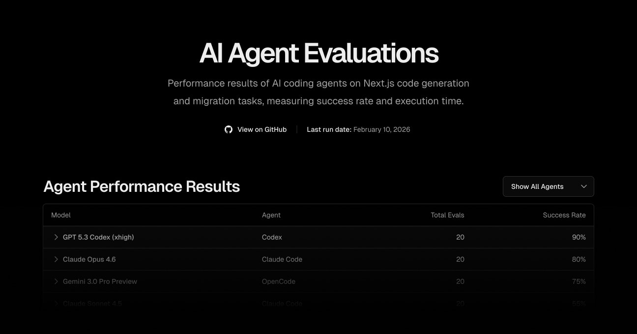 Descrição da ferramenta: Next.js Evals avalia o desempenho de agentes de IA na geração e migração de código Next.js, medindo taxa de sucesso e tempo de execução para otimizar processos de desenvolvimento.
