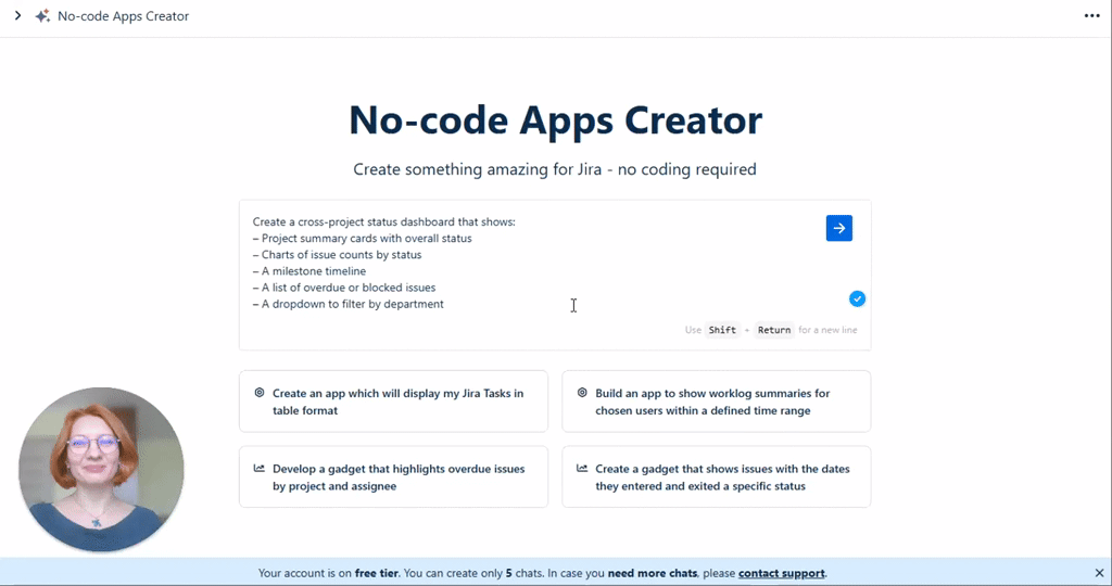 Descrição da ferramenta: Plataforma que permite criar aplicativos, painéis e widgets personalizados no Jira Forge usando inteligência artificial, sem necessidade de programação. Facilita a transformação de ideias em soluções rápidas e seguras, acessível via web.