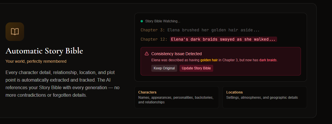 🔍 Detecção de contradições: Identifica inconsistências na narrativa antes que sejam escritas, aprimorando a qualidade do conteúdo.