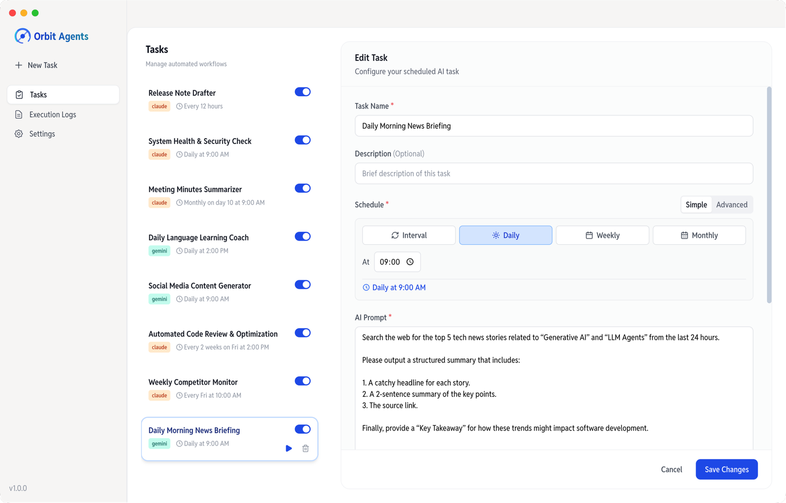 Descrição da ferramenta: Orbit Agents permite agendar e automatizar tarefas de IA localmente, integrando Claude ou Gemini com facilidade, sem necessidade de servidores ou custos na nuvem, oferecendo gerenciamento visual e suporte a diversas plataformas.