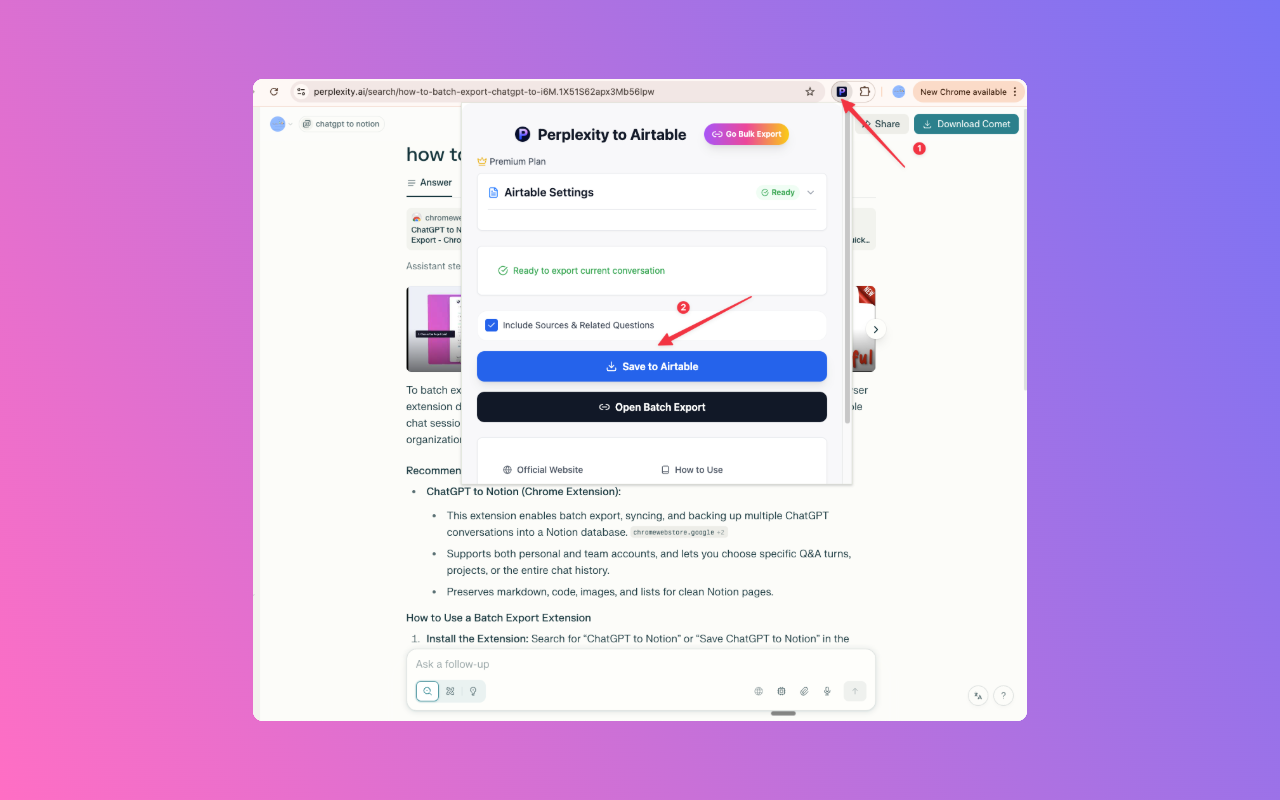 Descrição da ferramenta: Extensão Chrome que permite exportar, sincronizar e fazer backup de conversas do PerplexityAI em massa para o Airtable, facilitando a organização, pesquisa e armazenamento de informações geradas por IA.