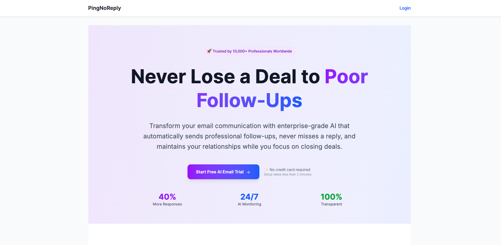 O PingNoReply é uma ferramenta que garante respostas a e-mails importantes, notificando o usuário ou automatizando acompanhamentos com inteligência artificial, ideal para fundadores, vendas e conversas cruciais.