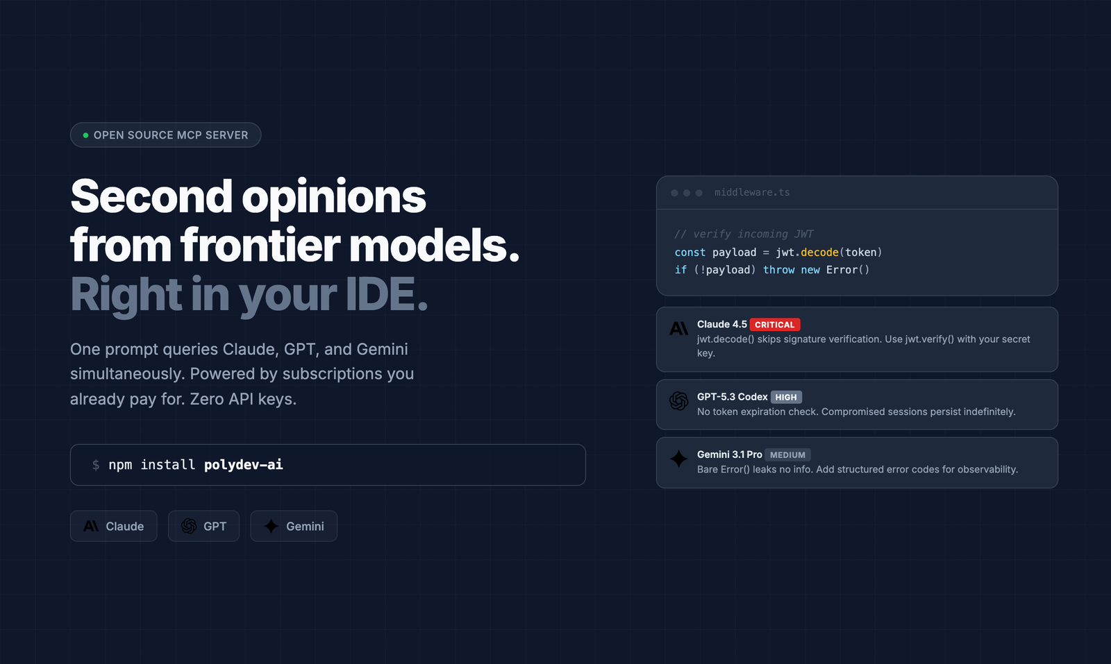 Descrição da ferramenta: Polydev é um servidor MCP que consulta modelos de IA avançados como Claude, GPT, Gemini e Grok simultaneamente, oferecendo opiniões rápidas e confiáveis diretamente na IDE, sem necessidade de chaves API ou custos adicionais.