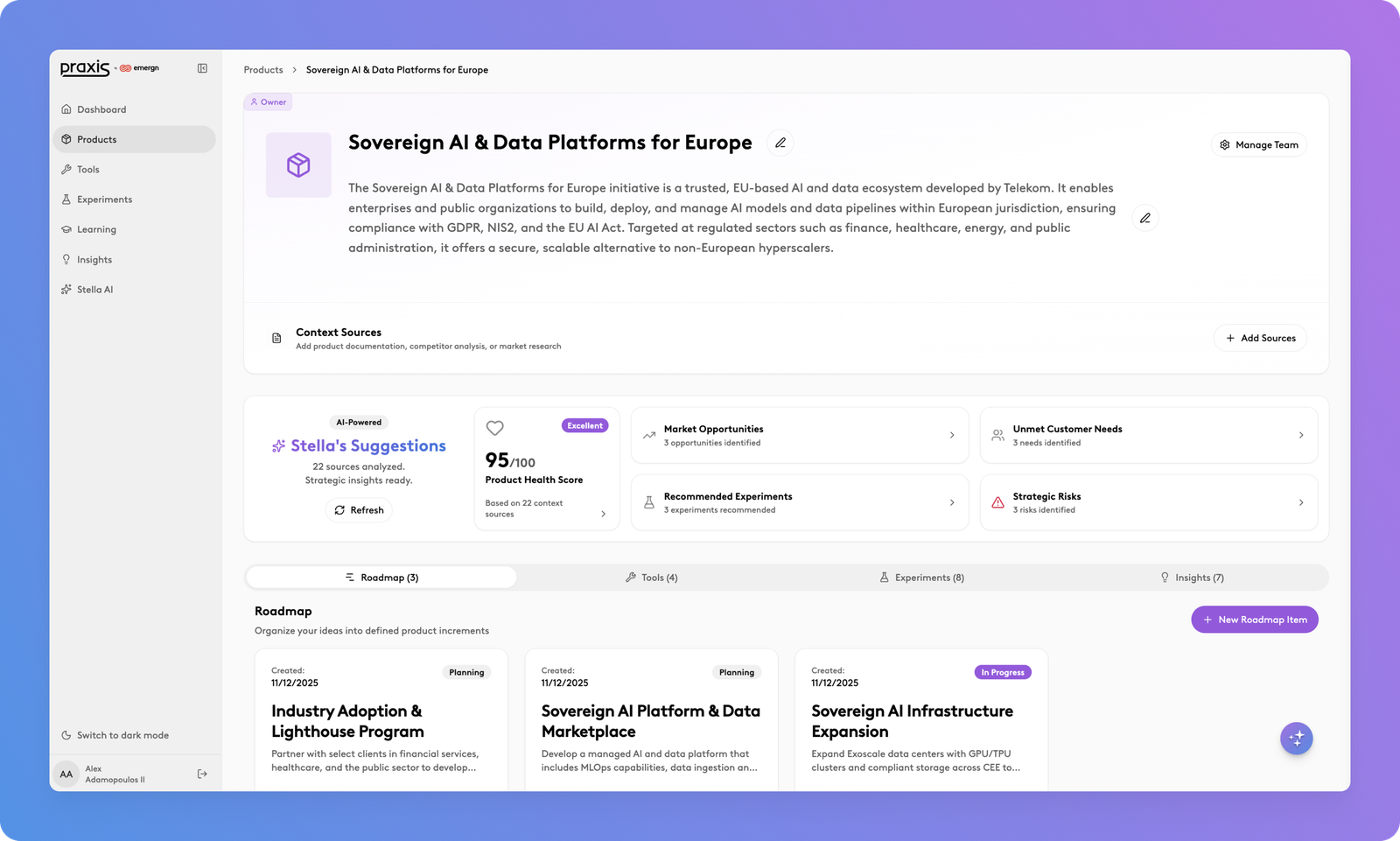 Descrição da ferramenta: Praxis by Emergn é uma plataforma de trabalho inteligente que integra estratégia, descoberta e planejamento de entregas, com suporte de Stella, uma IA treinada para orientar equipes em todas as etapas do projeto.