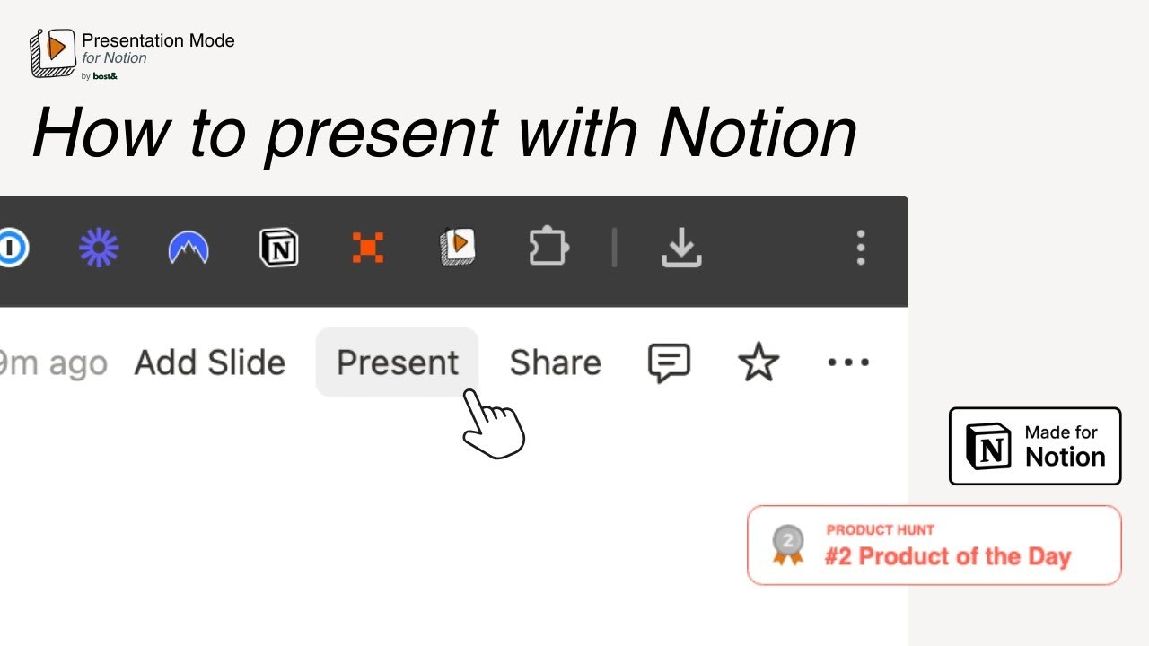 Descrição da ferramenta: O Presentation Mode for Notion converte páginas do Notion em apresentações de slides em tela cheia, facilitando a exibição direta no workspace sem necessidade de exportação ou troca de ferramentas.