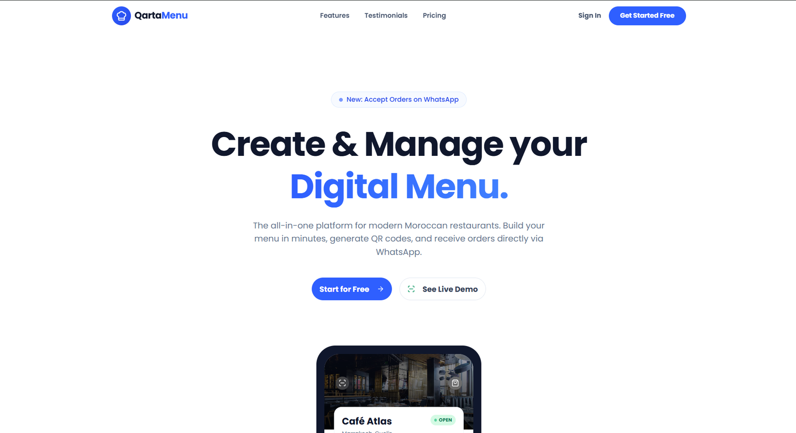 Descrição da ferramenta: QartaMenu digitaliza menus de papel, extrai os itens e associa automaticamente fotos profissionais, criando rapidamente um site de menu visualmente atraente em poucos segundos.