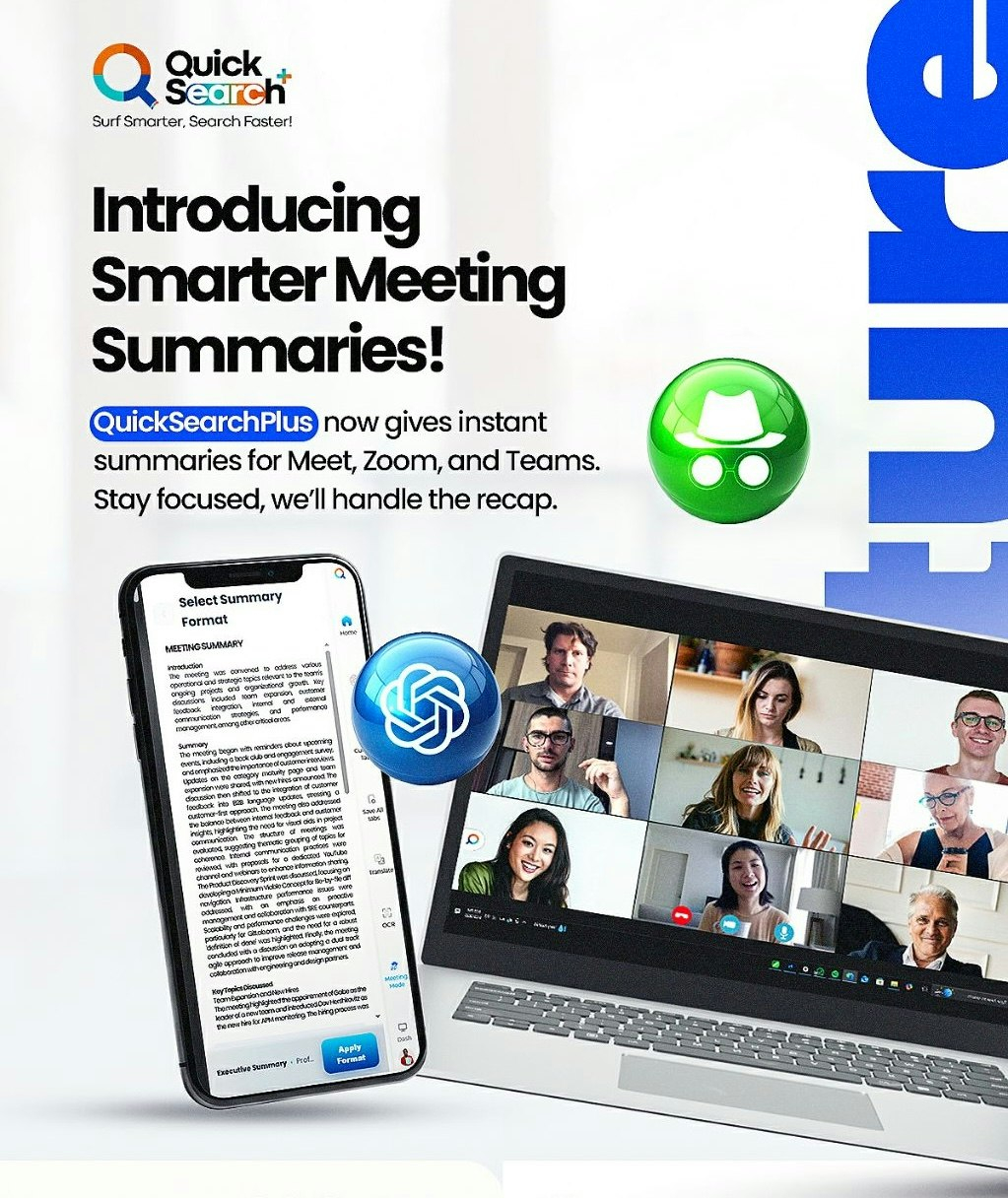 Descrição da ferramenta: QuickSearchPlus centraliza e gerencia todas as reuniões, integrando agendas, links de reserva e resumos automáticos, promovendo uma organização eficiente antes, durante e após os encontros.