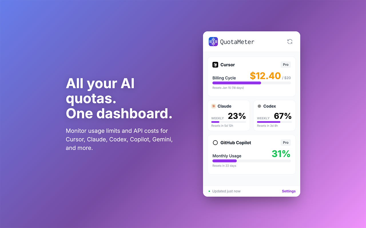 Descrição da ferramenta: QuotaMeter é uma ferramenta que centraliza o monitoramento de limites e custos de uso de diversas plataformas de IA, oferecendo controle eficiente por meio de um painel único, com opções de extensão e aplicativo para diferentes ambientes.