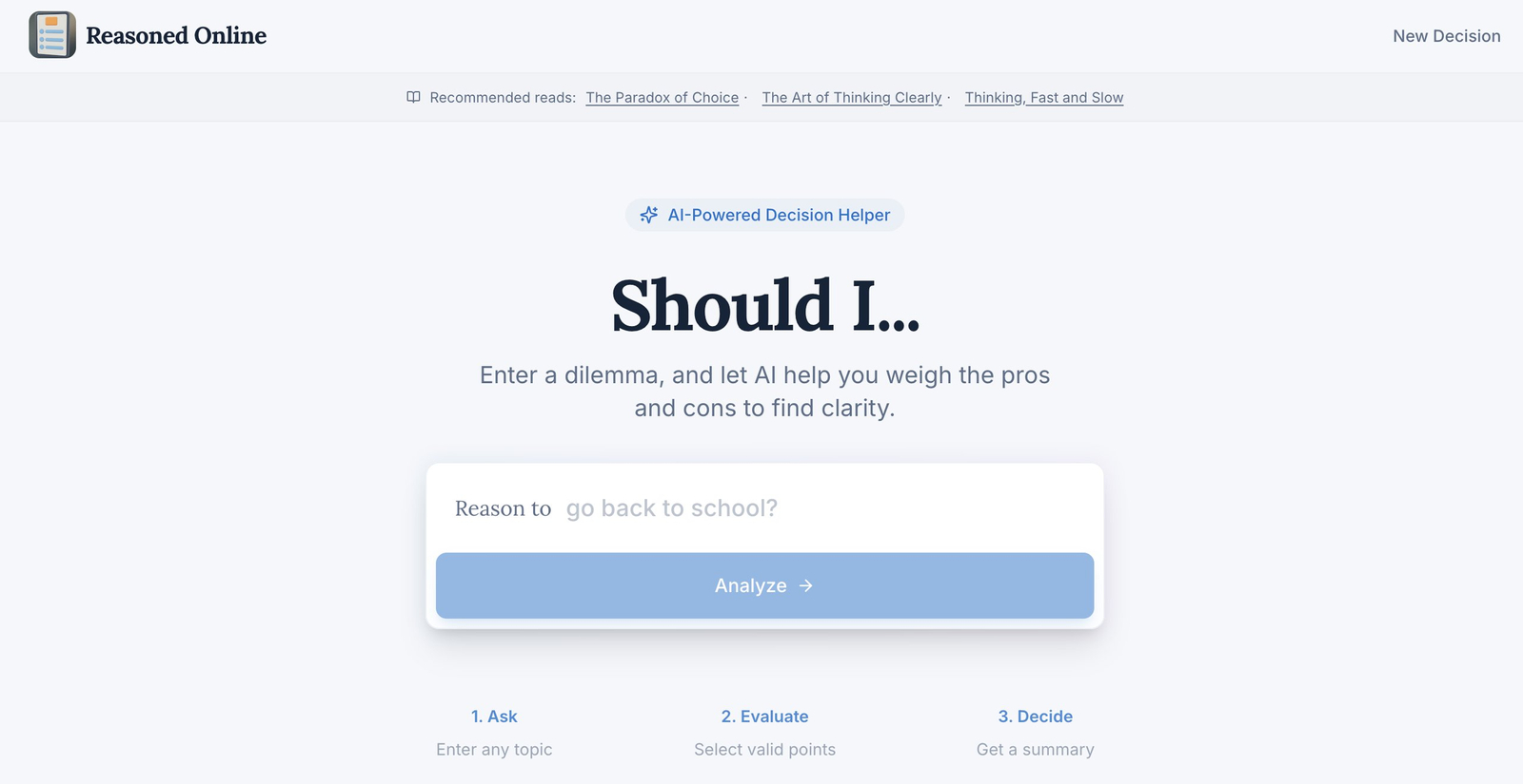 Descrição da ferramenta: Reasoned Online é uma plataforma que utiliza inteligência artificial para auxiliar na tomada de decisões, oferecendo um processo estruturado, intuitivo e eficiente para usuários em diversas áreas.