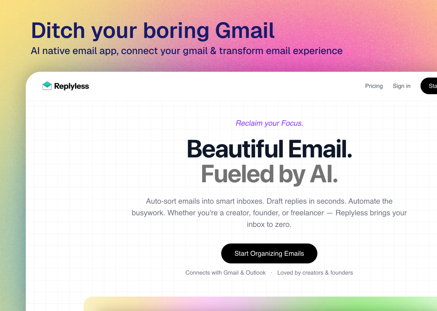 Descrição da ferramenta: ReplylessAI é um aplicativo de email com inteligência artificial que organiza e categoriza mensagens, facilitando alcançar a Caixa de Entrada Zero sem custos elevados ou assinaturas caras.