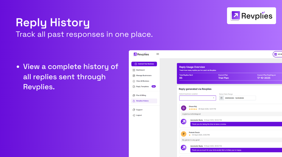 Revplies é uma plataforma que automatiza respostas a avaliações do Google usando inteligência artificial, permitindo personalização, gerenciamento de múltiplas localizações e perfis em um painel único, otimizando o tempo e fortalecendo a confiança do cliente.