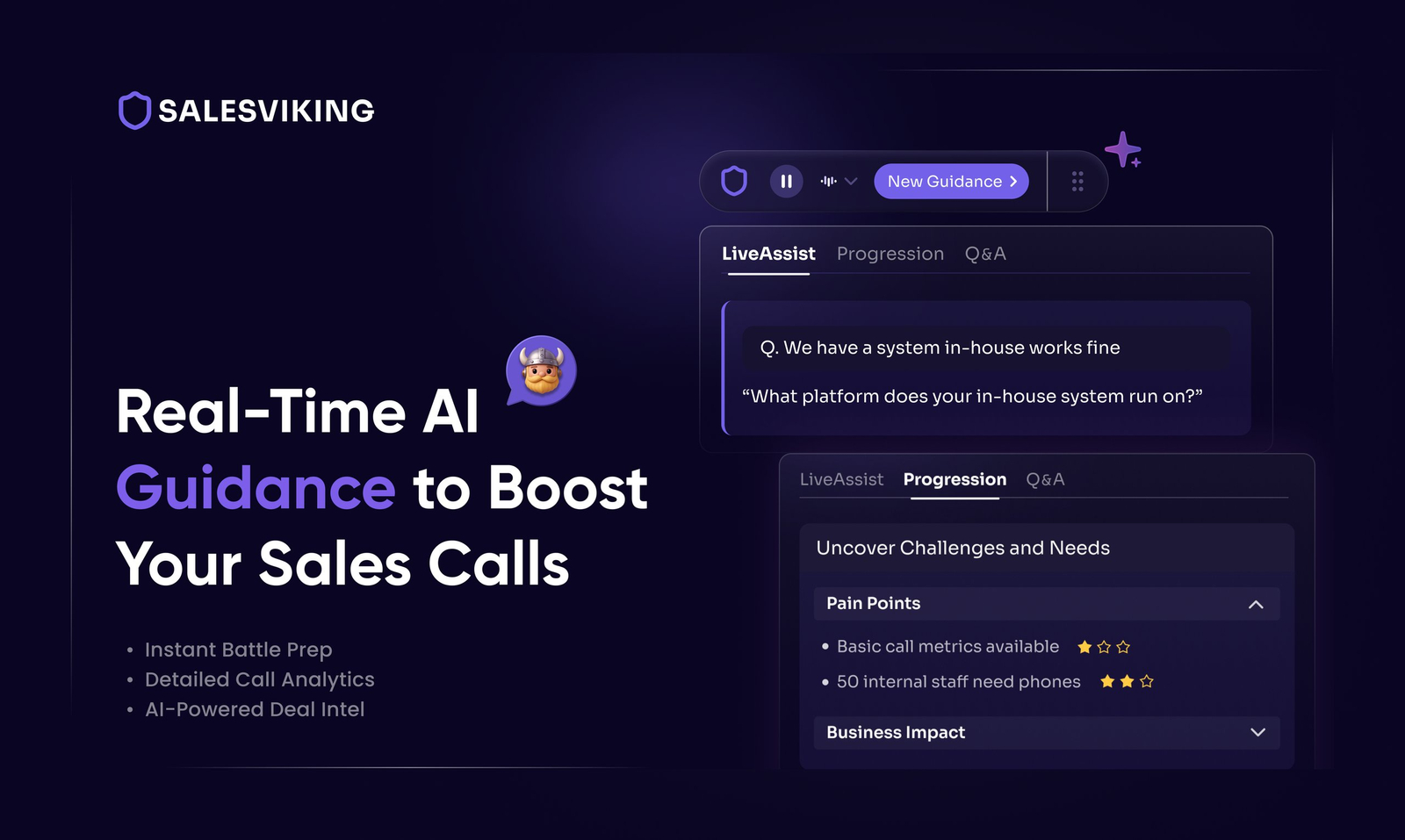 Descrição da ferramenta: SalesViking é uma ferramenta de inteligência artificial que acompanha chamadas de vendas em tempo real, identificando objeções e fornecendo respostas instantâneas para melhorar o desempenho do vendedor durante as negociações.