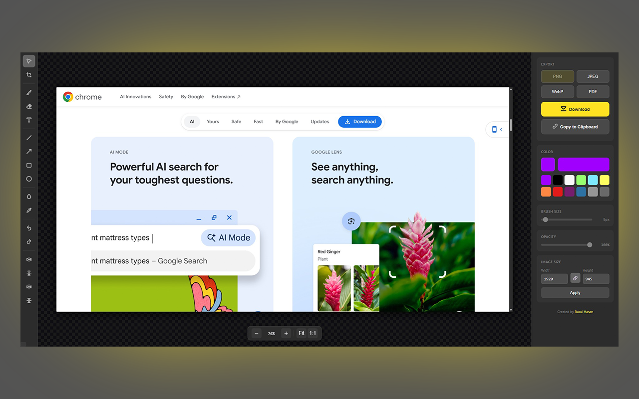 🚀 Exportação versátil: Exporta em formatos PNG, JPEG, WebP ou PDF, além de copiar ao clipboard rapidamente.