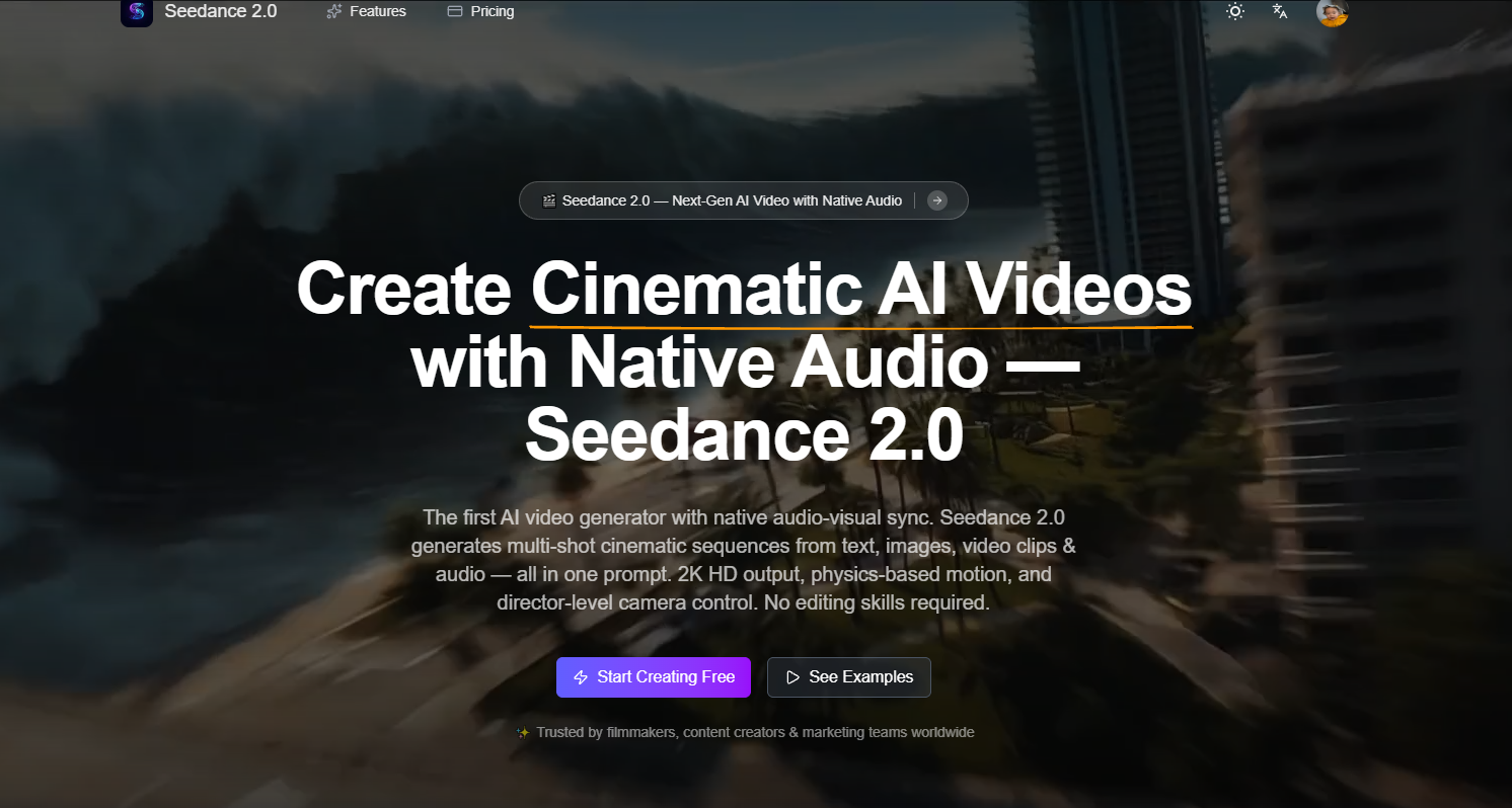 Descrição da ferramenta: Seedance 2.0 é uma plataforma que gera vídeos cinematográficos com sincronização de áudio nativa, múltiplas tomadas e controle multimodal, permitindo a criação de vídeos a partir de textos ou imagens em resolução 2K.