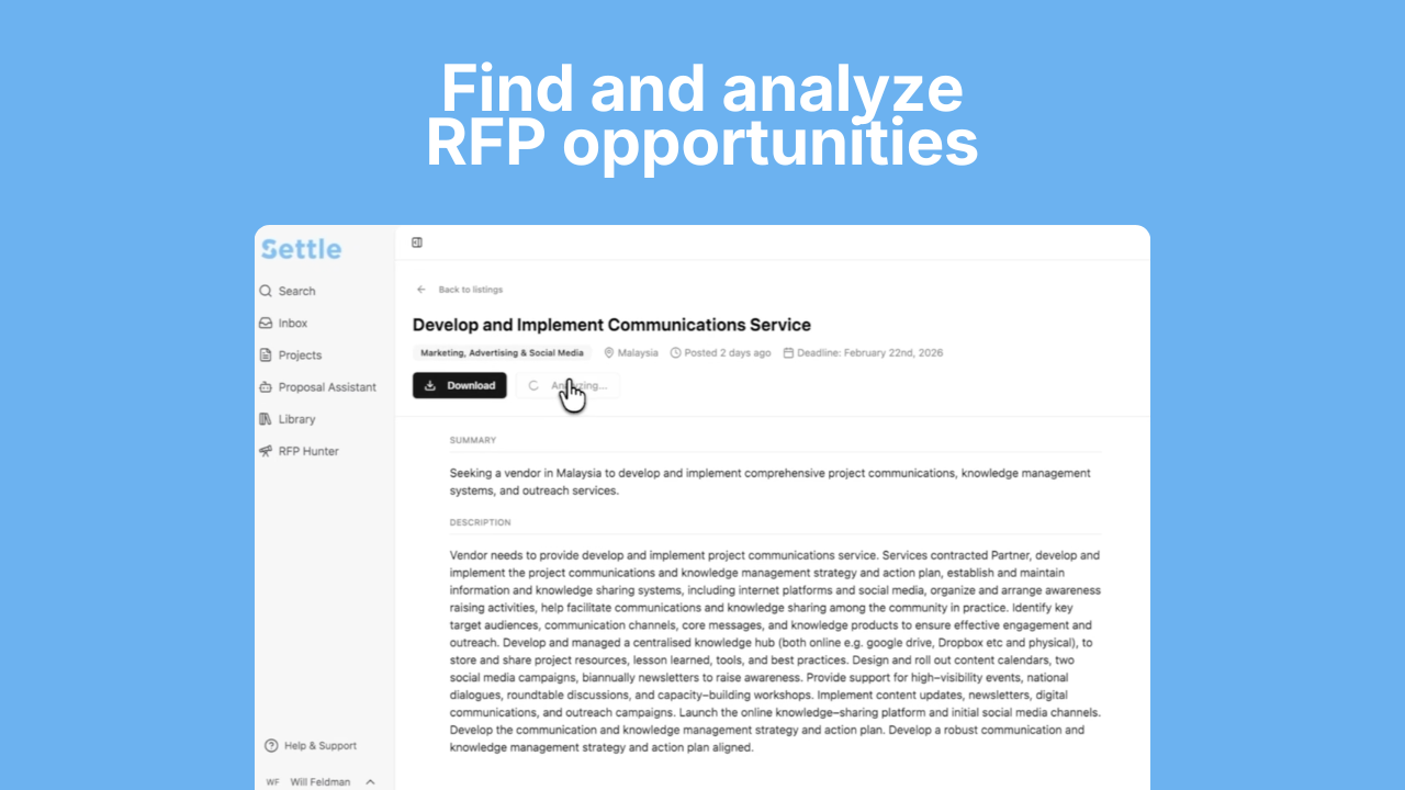 Settle é uma plataforma que automatiza a descoberta e resposta a solicitações de propostas (RFPs), auxiliando equipes a identificar oportunidades, gerar propostas automaticamente e gerenciar processos de licitação com inteligência artificial.