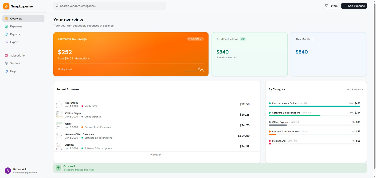 Descrição da ferramenta: SnapExpense é uma ferramenta que digitaliza recibos em segundos, categorizando automaticamente para o IRS Schedule C e facilitando a exportação de dados para contadores, otimizando o controle de despesas fiscais.