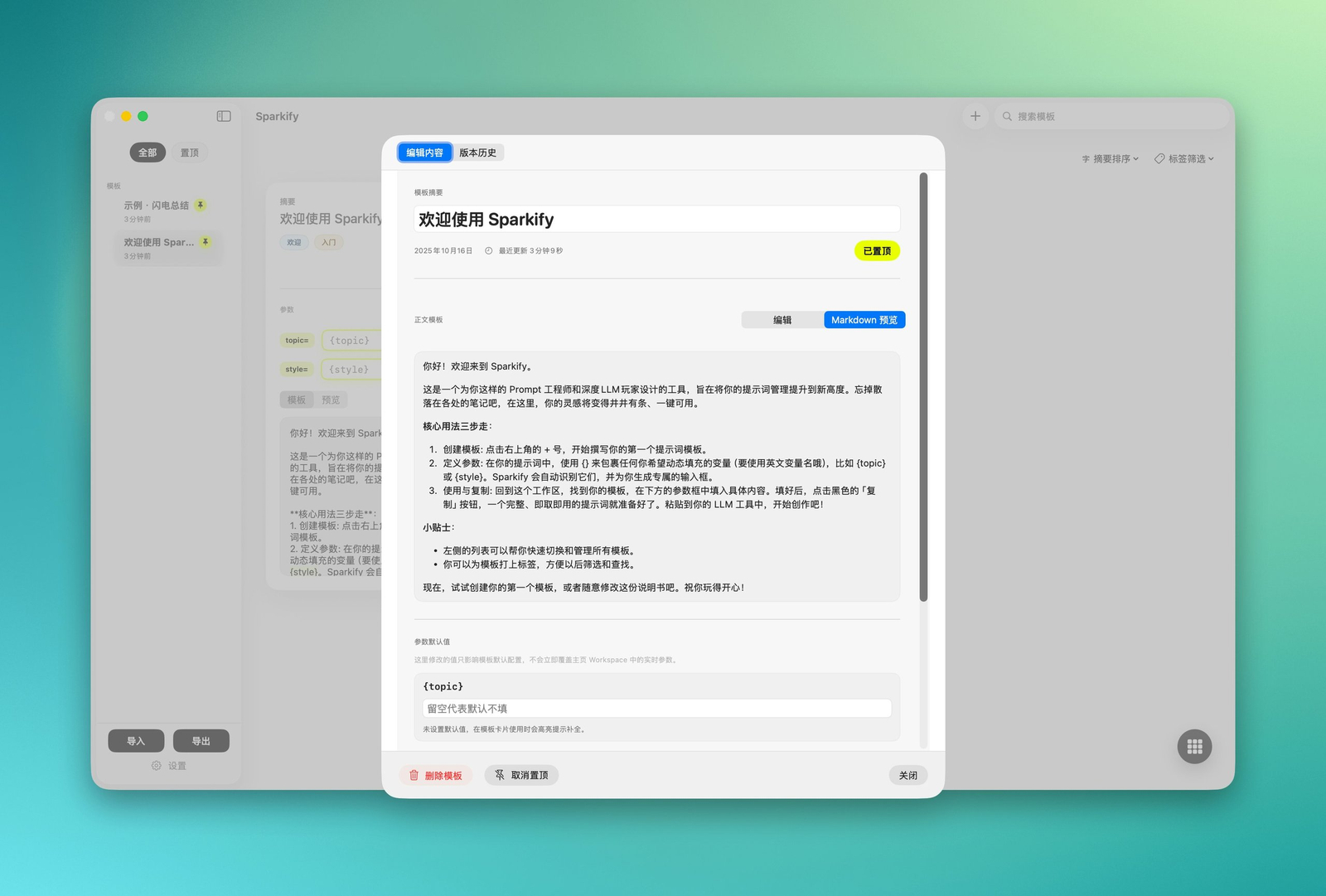 Descrição da ferramenta: Sparkify é uma aplicação que permite criar, gerenciar e versionar prompts de IA, oferecendo um motor de templates dinâmicos e sincronização local de arquivos, ideal para profissionais que trabalham com inteligência artificial.