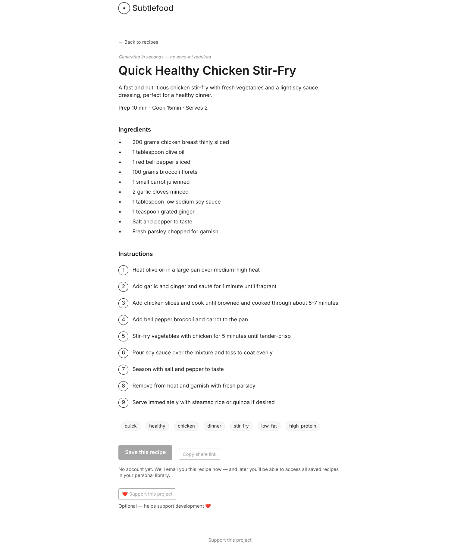 Descrição da ferramenta: Subtlefood é uma plataforma minimalista que permite criar, editar e salvar receitas de forma rápida e organizada, sem necessidade de cadastro ou anúncios, ideal para quem busca praticidade na gestão de receitas culinárias.