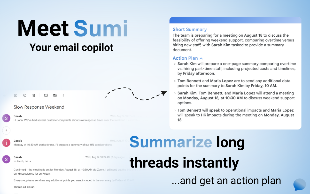 Descrição da ferramenta: Sumi é uma extensão de IA integrada ao Gmail que resume, redige e gerencia e-mails automaticamente, otimizando o fluxo de trabalho e facilitando a organização da caixa de entrada.