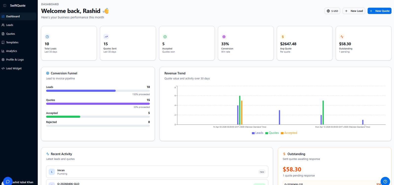 Descrição da ferramenta: SwiftQuote é uma plataforma que permite a geração rápida de orçamentos por profissionais, com assinatura digital pelo cliente, integrando todo o fluxo de vendas desde a cotação até a emissão de faturas, em um ambiente único e eficiente.