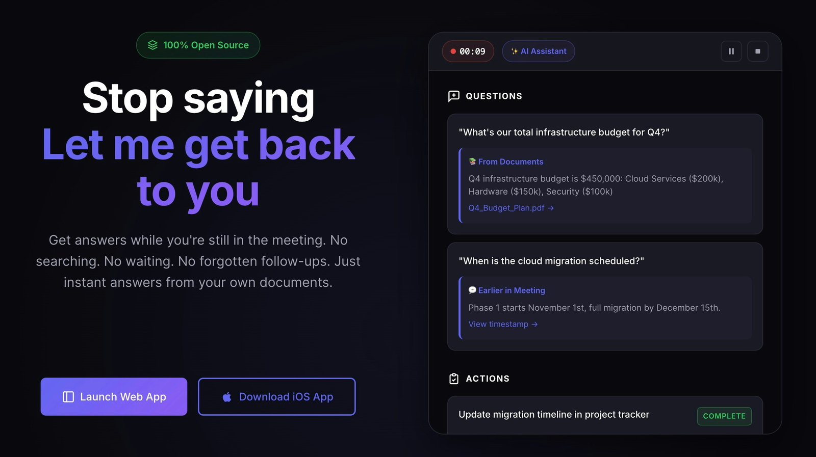 Descrição da ferramenta: TellMeMo é uma ferramenta de assistência em reuniões que identifica perguntas em tempo real e fornece respostas rápidas, otimizando o tempo e a eficiência durante encontros profissionais. É de código aberto e possui alta taxa de resposta.