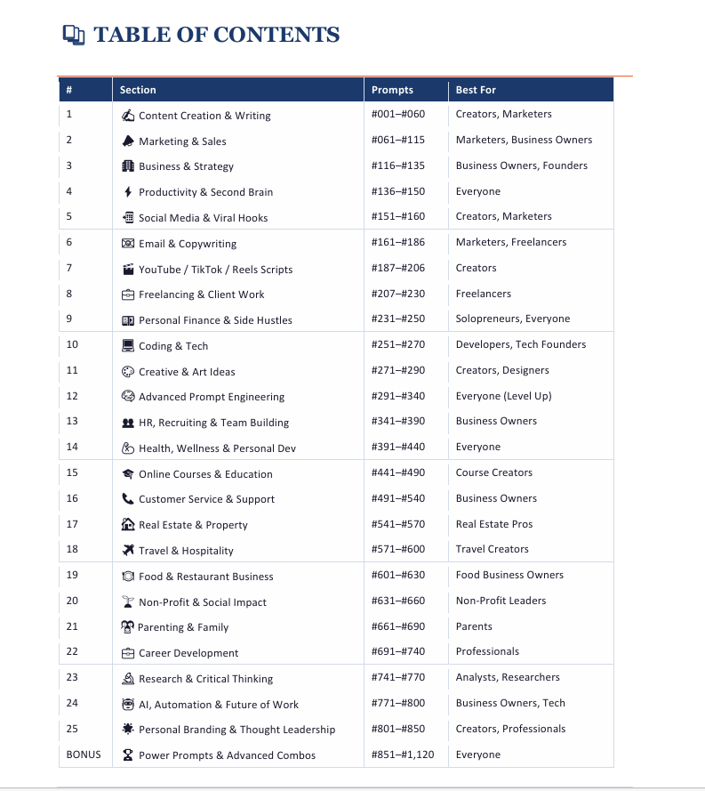 Descrição da ferramenta: A The Ultimate AI Prompt Library 2026 oferece uma coleção organizada de 1.120 prompts testados para diversas plataformas de IA, facilitando a geração de resultados eficientes para profissionais e criadores em múltiplas categorias.