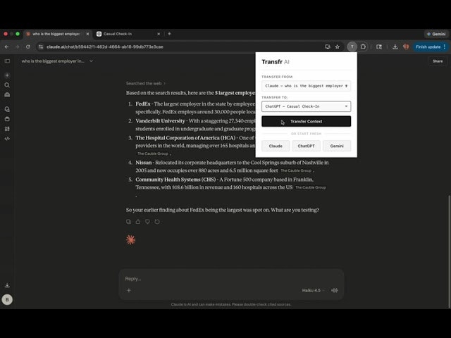 Descrição da ferramenta: Transfr AI permite transferir rapidamente conversas de inteligência artificial entre plataformas como Claude, ChatGPT e Gemini, facilitando a continuidade do diálogo em diferentes ambientes de IA.