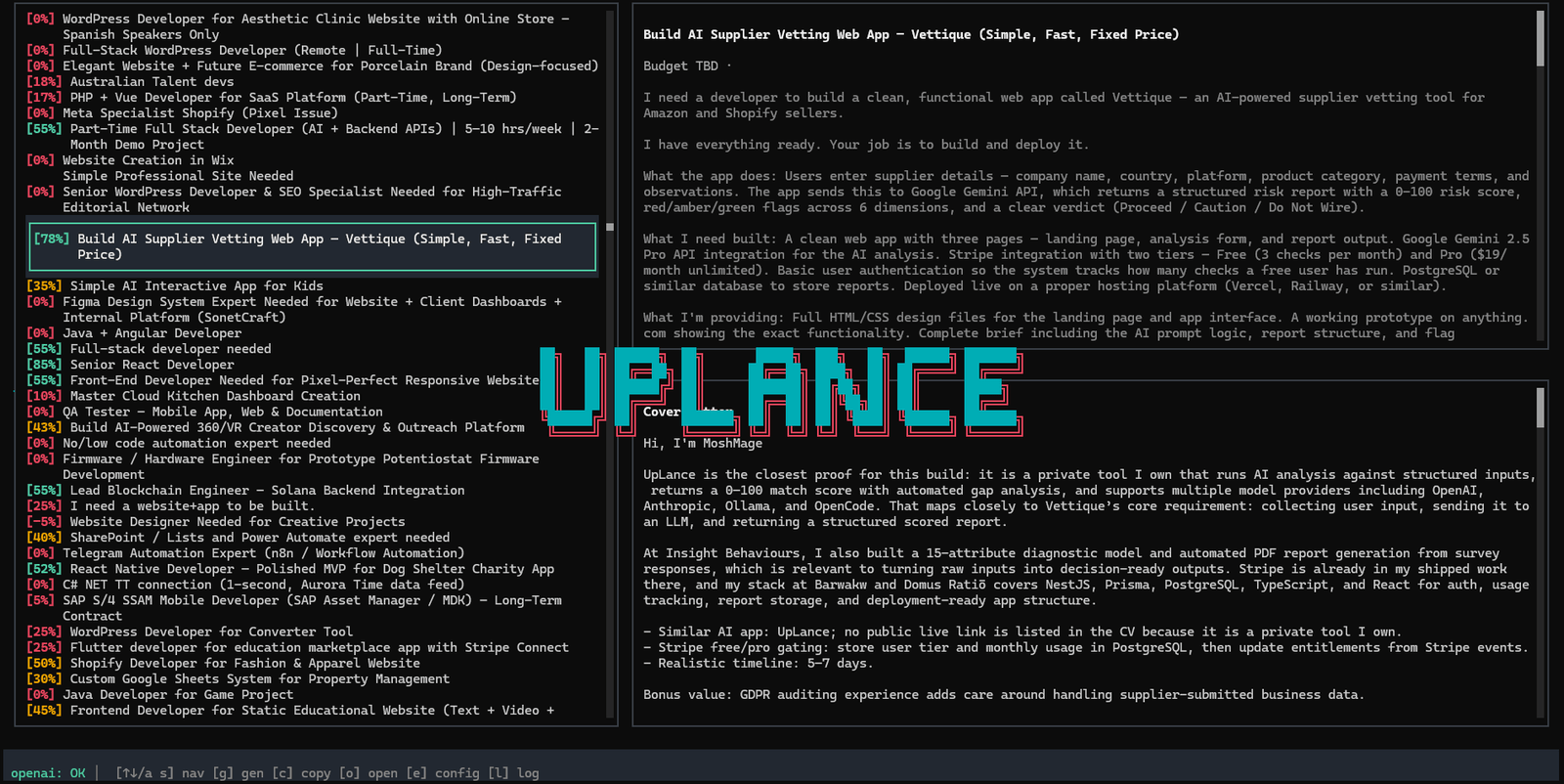 Descrição da ferramenta: UpLance é uma interface de usuário em terminal (TUI) de alto desempenho, voltada para freelancers seniores, que otimiza a triagem de trabalhos, calcula a correspondência real e redige propostas técnicas eficazes, eliminando interfaces web lentas e conteúdo irrelevante.