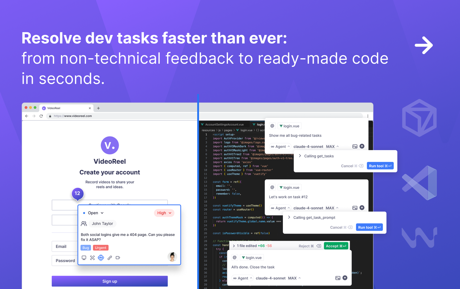 Descrição da ferramenta: Webvizio for AI Coding Agents converte feedback não técnico e relatórios de bugs em código pronto em segundos, facilitando a resolução rápida de tarefas de desenvolvimento com suporte de IA.