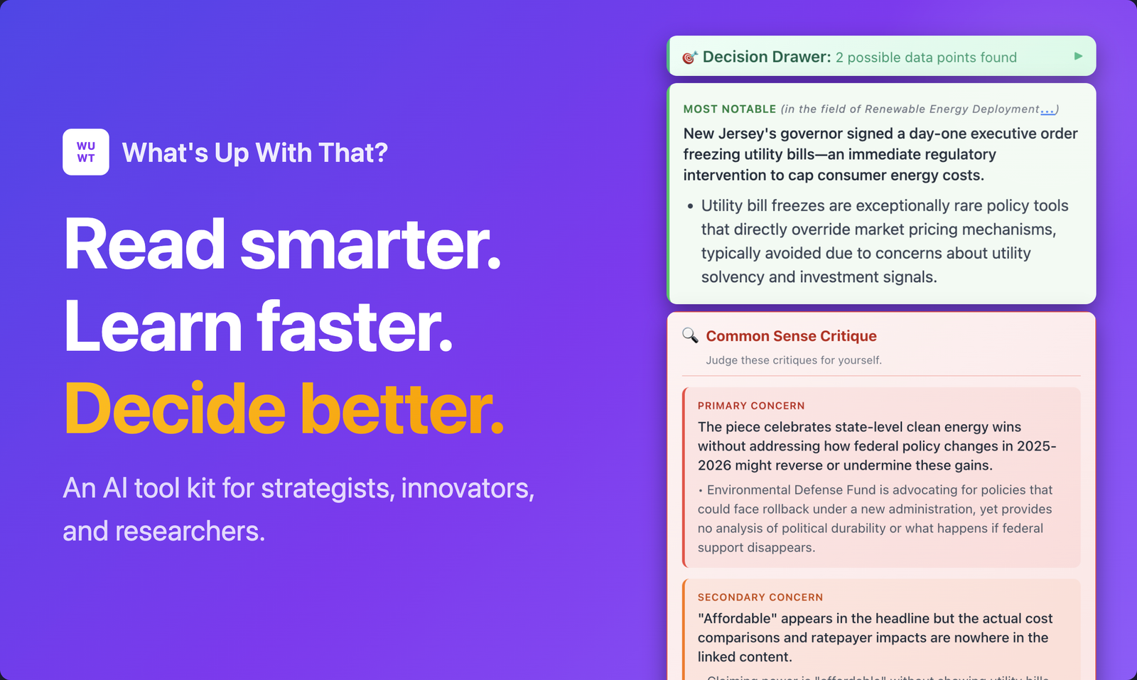 Descrição da ferramenta: What’s Up With That? é uma extensão de navegador que fornece um mapa em tempo real do estado da arte em qualquer setor, oferecendo insights rápidos e ferramentas de IA para análise e pesquisa instantânea ao ler artigos.