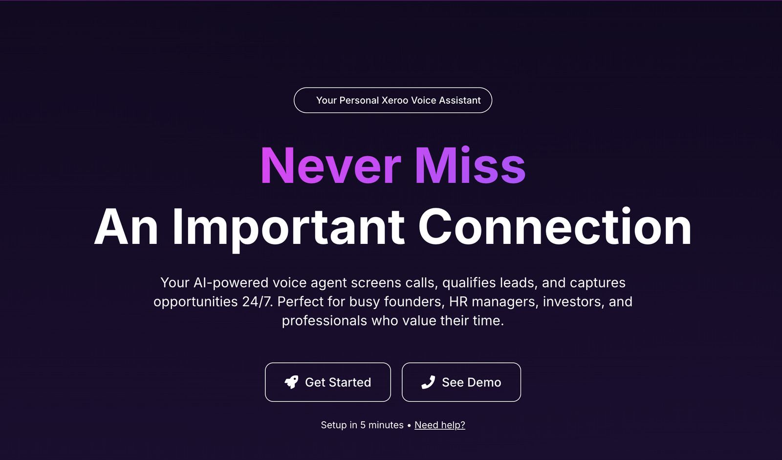Descrição da ferramenta: Xeroo é um assistente de voz AI personalizado que gerencia chamadas, filtra spam, encaminha contatos importantes e fornece resumos detalhados, garantindo que o usuário nunca perca uma comunicação relevante.