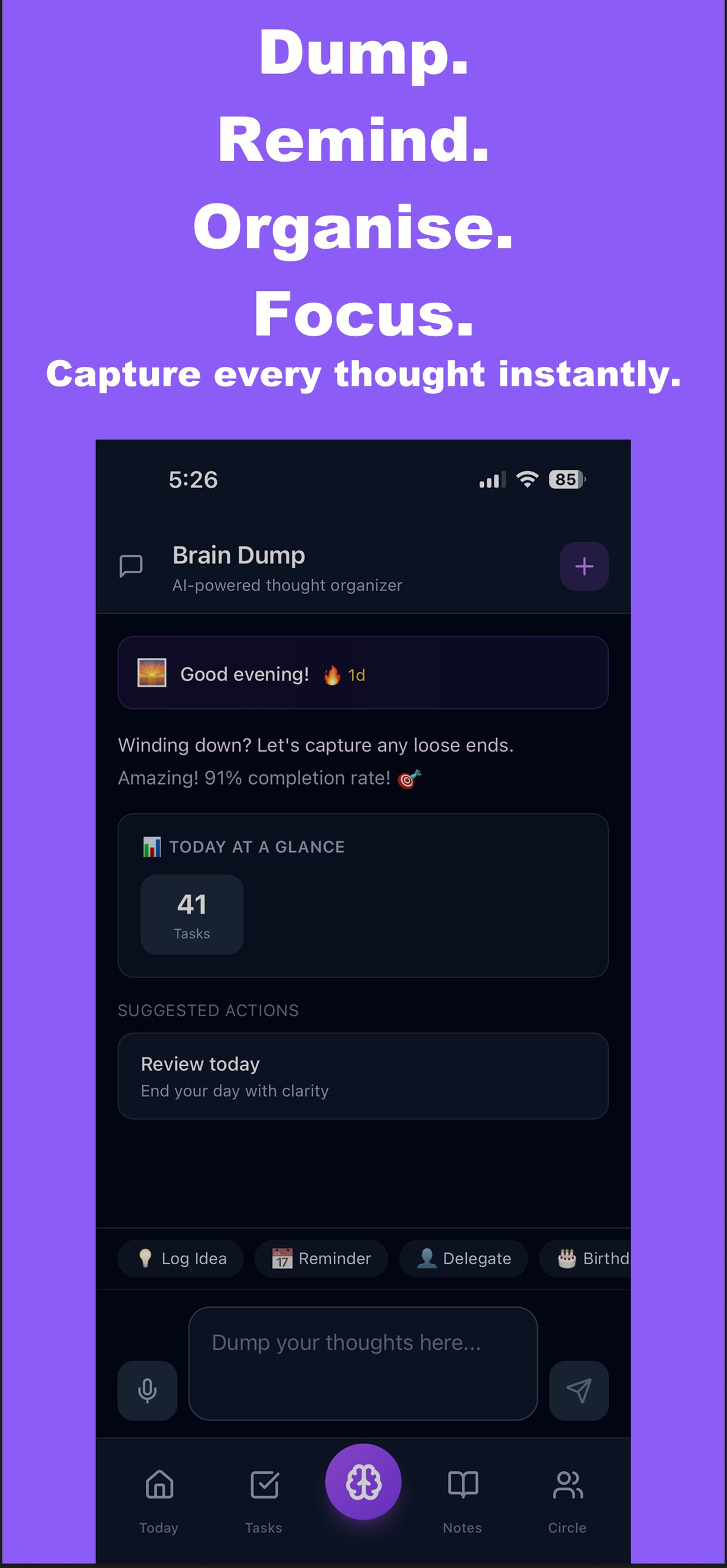 Descrição da ferramenta: ZenDump é uma aplicação de produtividade que permite descarregar, organizar e gerenciar tarefas, lembretes e notas em linguagem simples, com recursos de foco, compartilhamento e integração com calendário, localização e contatos.