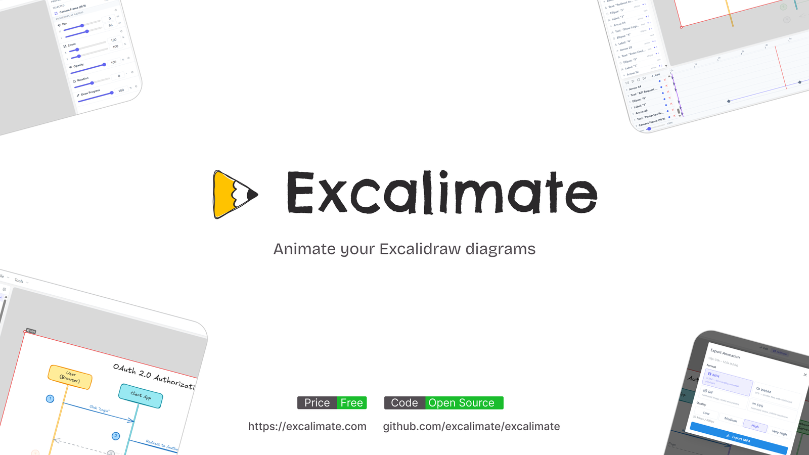 Descrição da ferramenta: Excalimate converte desenhos feitos no Excalidraw em animações de quadros-chave, permitindo criar vídeos e GIFs com efeitos como fade, slide e rotação, além de suportar integração com agentes de IA para animações em tempo real.